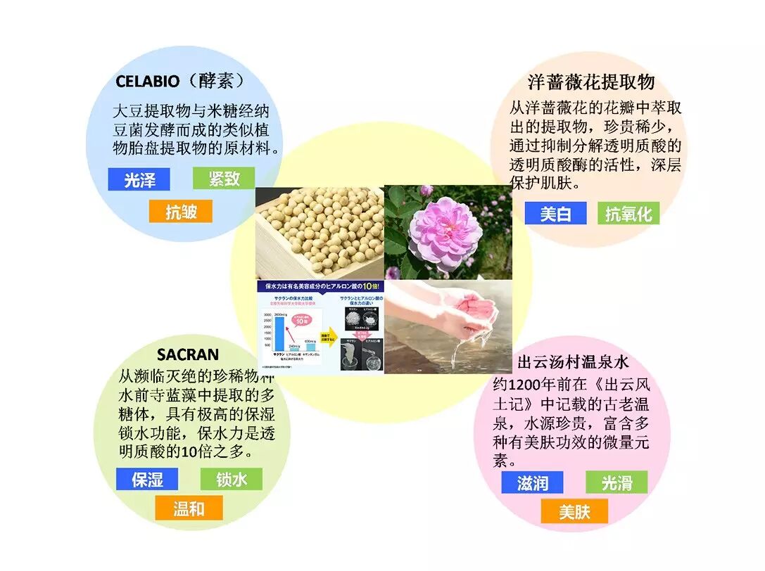 从濒危物种水前寺蓝藻中提取的多糖体SACRAN,具有极高的保湿锁水能力,能吸收自身重量5000倍的水分,比知名美容成分玻尿酸还强10 倍的保水力。